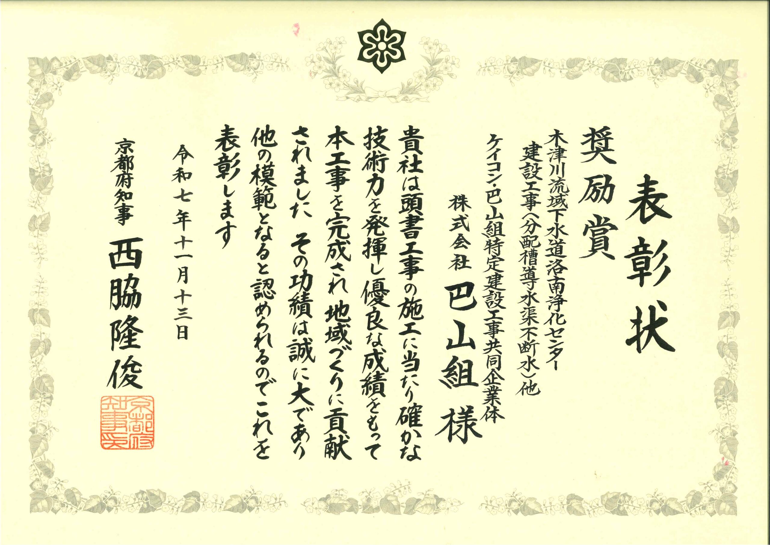 京都府知事より、奨励賞を表彰いただく